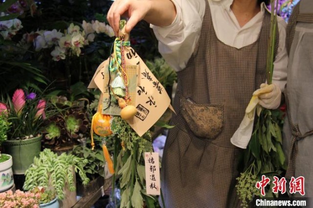 中新网杭州6月9日电(奚金燕 王云晴)“这种新式的门挂很好看,寓意也好,放在家里既能装饰又能驱邪纳福。”这个端午假期,在杭州吴山花鸟城,购买了三束艾草门挂的张女士正准备回家与家人过节。她表示,新中式艾草门挂虽然价格比艾草束贵,但胜在款式新颖。