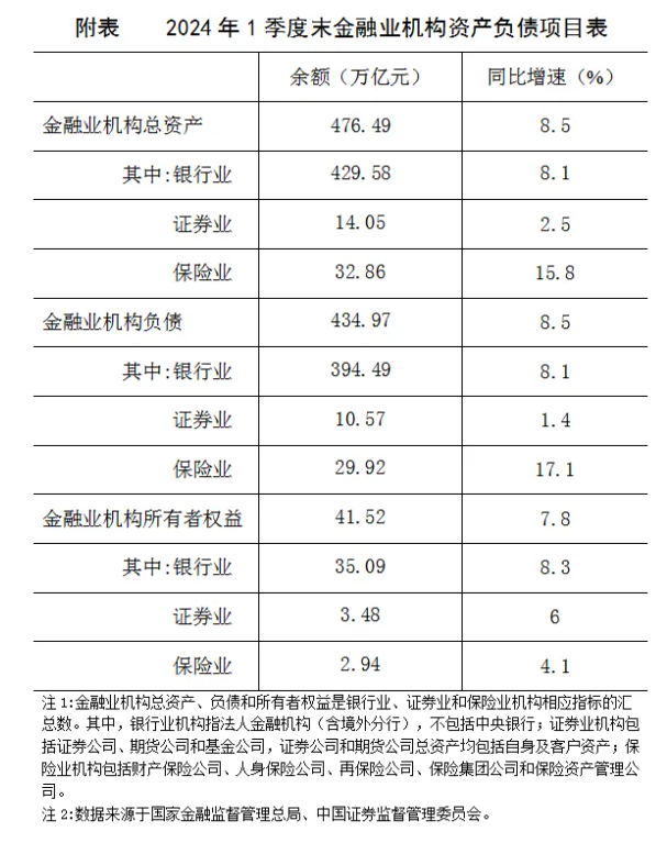 中新网6月20日电 据中国人民银行官方微信消息,初步统计,2024年1季度末,我国金融业机构总资产为476.49万亿元,同比增长8.5%,其中,银行业机构总资产为429.58万亿元,同比增长8.1%;证券业机构总资产为14.05万亿元,同比增长2.5%;保险业机构总资产为32.86万亿元,同比增长15.8%。