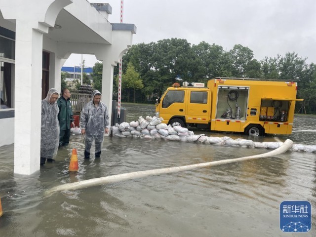 ↑6月20日,黄山徽州经济开发区组织防汛应急排水车排出辖区企业厂区积水。
