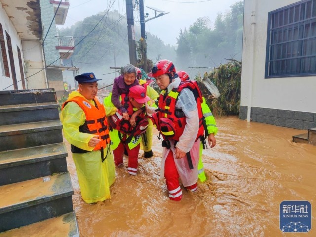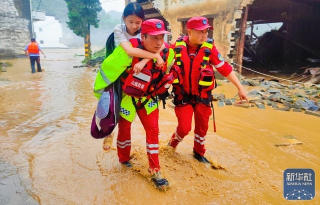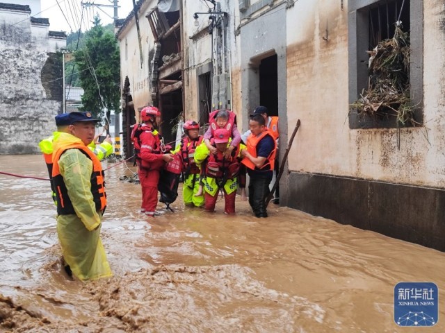 ↑6月20日,黄山市山越救援队在黄山市歙县绍濂乡转移群众。