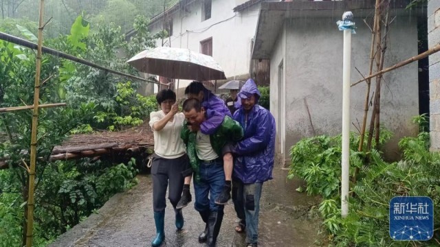 ↑6月19日,在黄山市黄山区新明乡新明村一处滑坡地质灾害隐患点,村干部帮助转移群众。