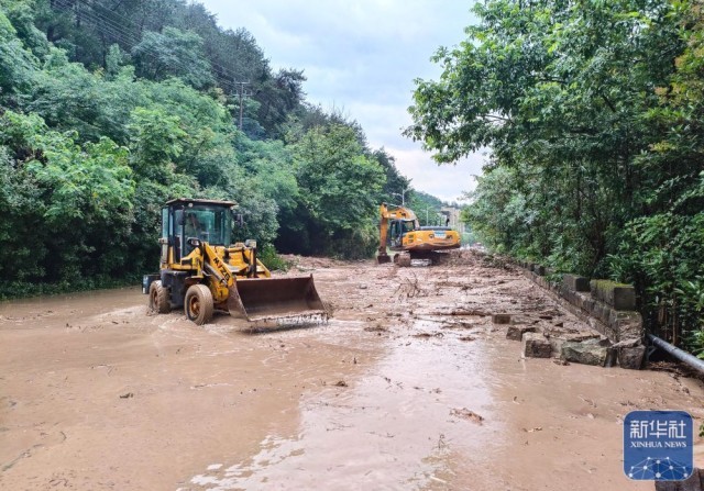 ↑6月20日,在黄山市屯溪区,工作人员清理塌方路段。