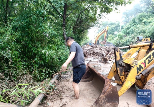 ↑6月20日,在黄山市歙县徽城镇,工作人员用挖掘机阻拦积水道路,防止车辆误入。