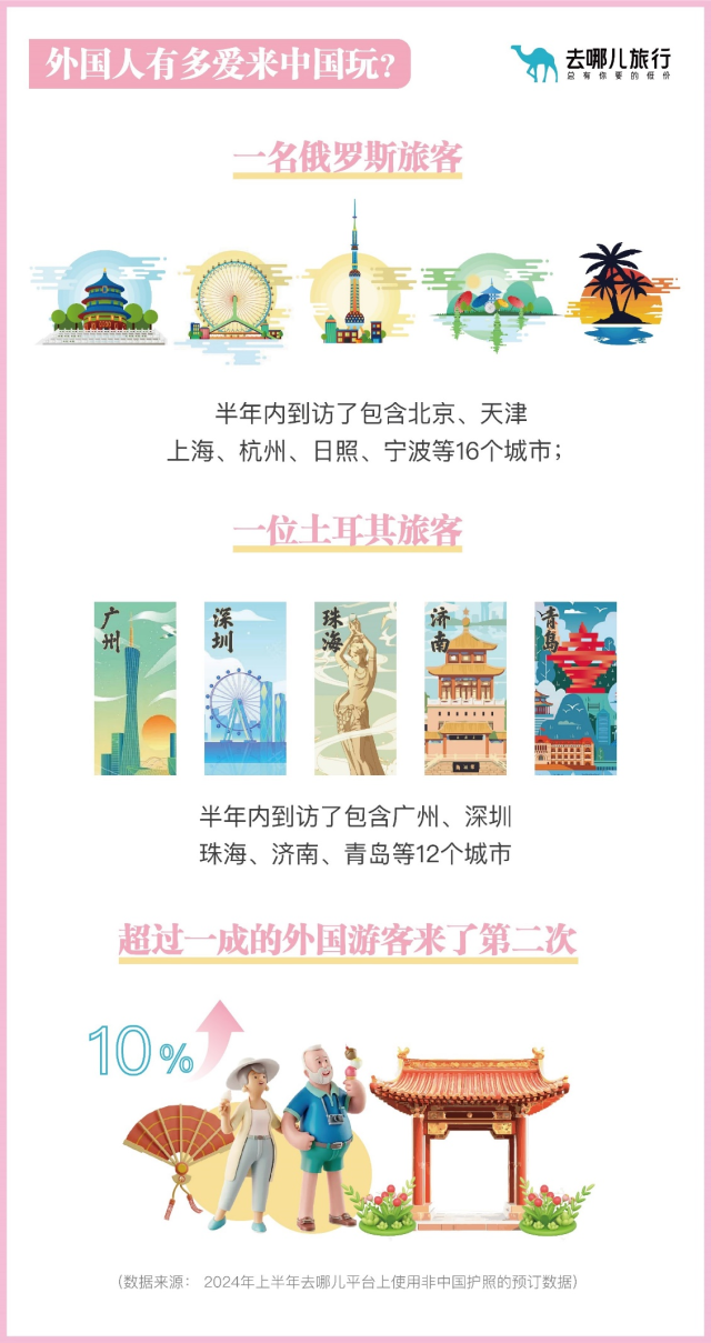 基于免签便利,一些外国游客更纷纷化身中国游“特种兵”。去哪儿平台上,一位俄罗斯旅客半年内到访了北京、天津、上海、杭州、日照、宁波等16个中国城市,另一位土耳其旅客则先后打卡了广州、深圳、珠海、济南、青岛等12个城市。