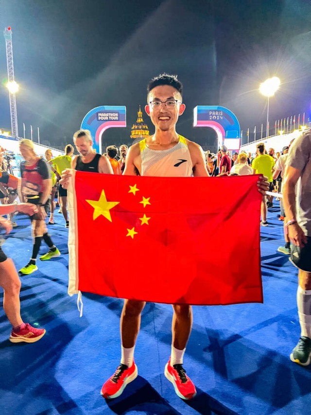 跑完后,他累得躺在了终点附近,除了沿途的补给站,杨浩冰最期待的是在观众中看到中国人的身影。“一路嘈杂声中‘加油’声格外响亮,听得内心非常感动,也更有动力了。”跑到终点,杨浩冰拿出国旗跟身后的跑道合影留念,领到完赛奖牌,他在朋友圈分享道:“准备了三年来到巴黎,尽管低烧状态很差,赛道也太虐,但也算是如愿完成奥运梦想,值得了。”