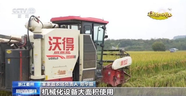 在衢州柯城区的一片稻田里,金黄的晚稻成块连片,串串稻穗颗粒饱满,压弯了稻秆,收割机在田间穿梭。农场负责人介绍,今年他们加大了机械化设备的使用比例,提升了种植效益。