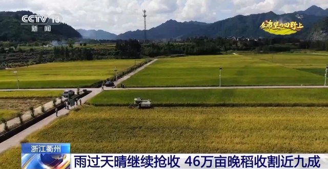 同样,浙江衢州也是雨过天晴。目前,当地的46万亩单季晚稻已收割近九成,农户们在积水退去后抓紧抢收作业。