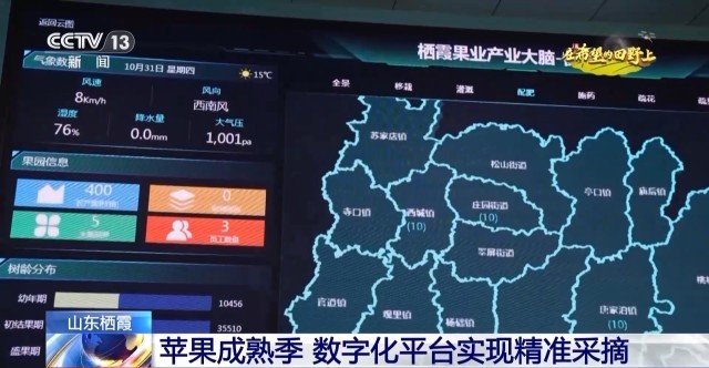 栖霞市供销合作社联合社负责人 李国勇:通过这个大屏,我们可以清楚地看到果树的生长情况,平台也会将果树生长情况相关信息通报给果农进行精准采摘。