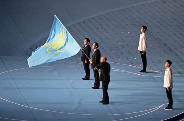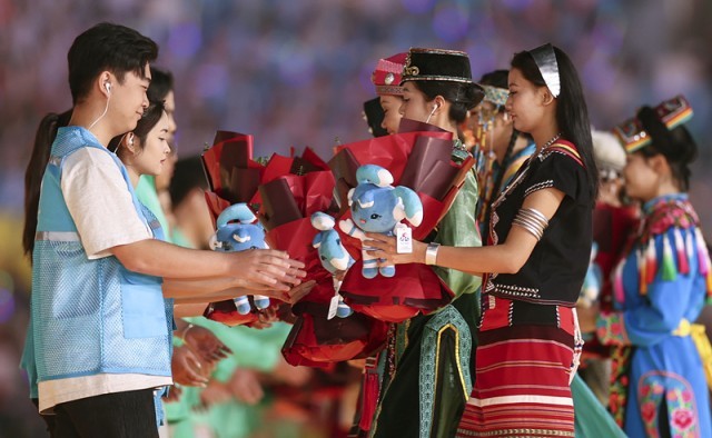 第十二届全国少数民族传统体育运动会闭幕式于11月30日在三亚举行,图为会旗交旗仪式。运动会网上新闻中心/新华社记者周牧摄