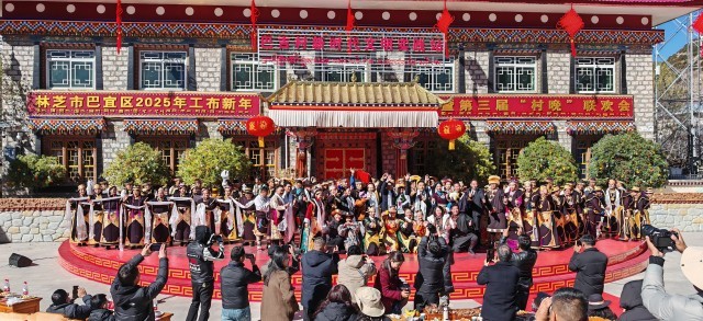 初冬时节,西藏林芝市巴宜区巴吉村村道两旁的树枝上挂满红彤彤的灯笼,处处喜气洋洋,工布新年年味浓郁,文化活动广场上更是热闹非凡。11月30日,巴宜区迎来了一年一度的文化盛事,2025年工布新年暨第三届“村晚”联欢会在巴吉村隆重举行。
