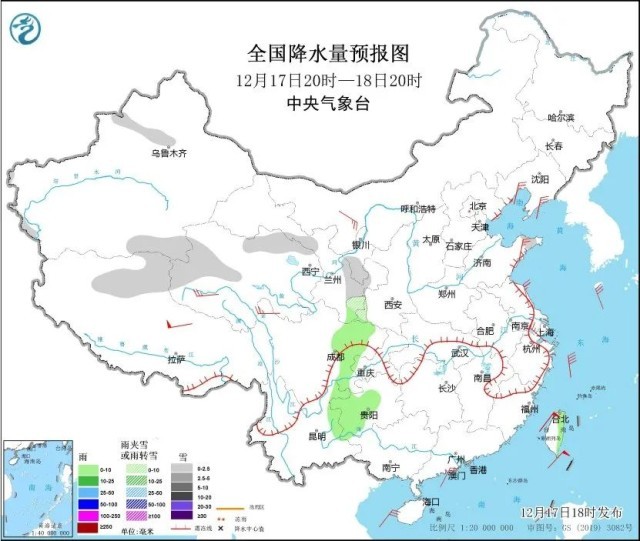 新疆天山北坡和南疆山区、青海西部和北部、宁夏中南部、甘肃河西和东部、陕西西南部、山东半岛等地部分地区有小雪或雨夹雪。四川盆地、贵州西部、云南东北部及台湾岛东部等地部分地区有小雨。