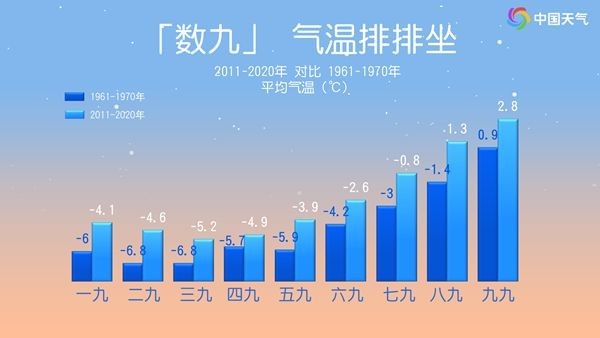 而从2011年至2020年与1961年至1970年的对比来看,整个数九期间的气温都明显上升,像是二九、五九、七九、八九气温升幅都达到或超过2℃。
