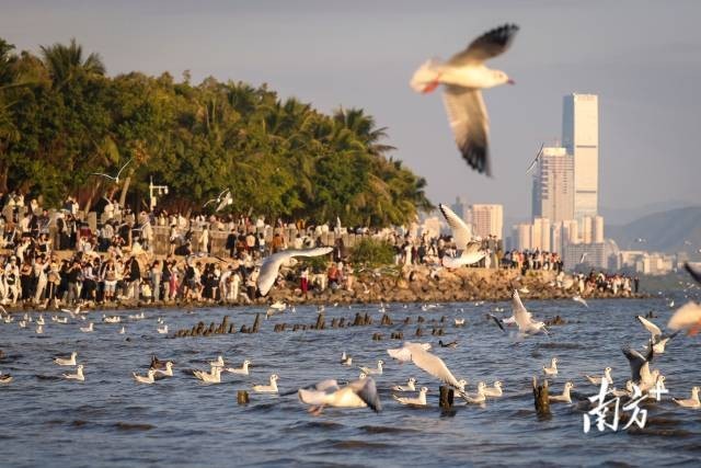 深圳湾公园上空成群结队的候鸟飞跃海面。