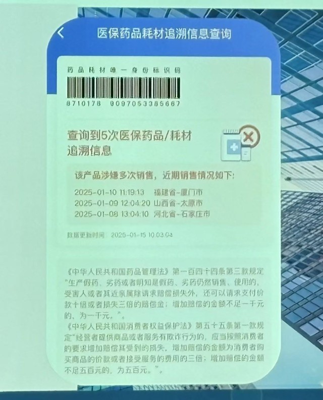 扫描追溯码之后出现的药品多次销售的信息。国家医保局供图