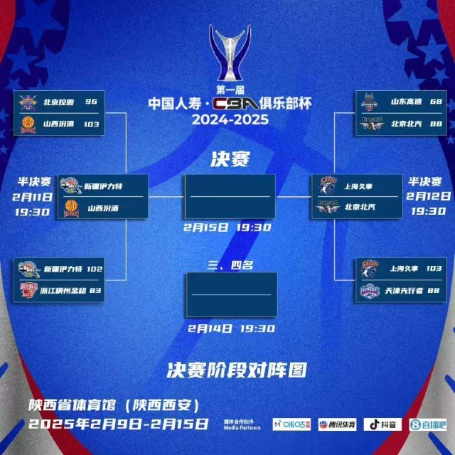 CBA俱乐部杯决赛阶段的比赛,被安排在陕西西安进行,从小组赛杀出的8支球队新疆、浙江、北控、山西、上海、天津、山东、北京,分别在9日、10日两天采取单败淘汰的比赛方式,决出进入四强的球队。