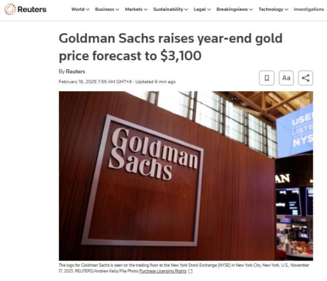 中新网2月18日电(宫宏宇)据路透社报道,高盛2月17日将2025年年底金价预期从2890美元/盎司上调至3100美元/盎司。