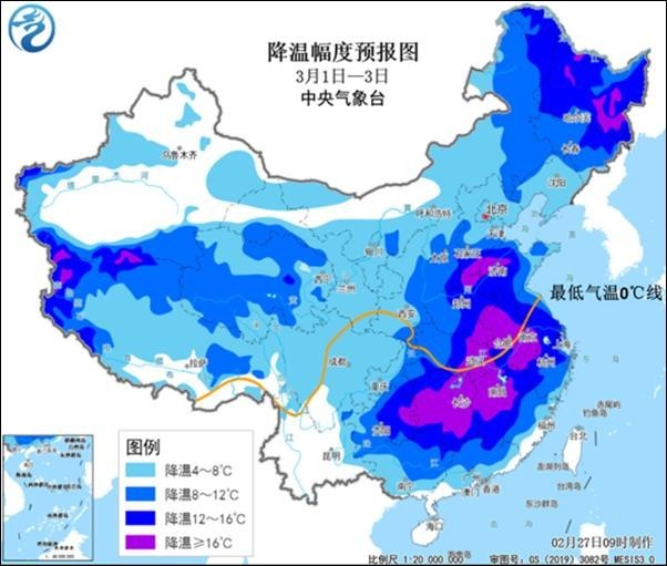 除了大范围雨雪,寒潮还会给中东部制造剧烈降温。今后三天,中东部气温将自北向南先后下降6至10℃。其中,华北南部及其以南的大部地区降温12至16℃,部分地区降温18℃以上;4日早晨,最低气温0℃线将南压到江汉至沿淮一带。
