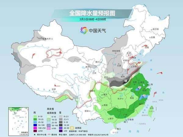 今明两天,随着寒潮大举南下和暖湿气流激烈交汇,中东部降水进入过程最强时段,伴随着降温,西北地区东部、华北西部和南部、黄淮、江汉、江淮等地将陆续出现雨转雪过程,其中,山东降水相态复杂。后天,江南、华南等地仍有大范围降雨。