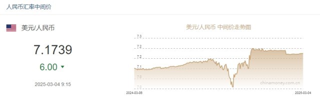 中新网3月4日电 据中国外汇交易中心网站消息,中国人民银行授权中国外汇交易中心公布,2025年3月4日银行间外汇市场人民币汇率中间价为:1美元对人民币7.1739元,上调6个基点。