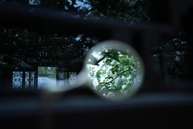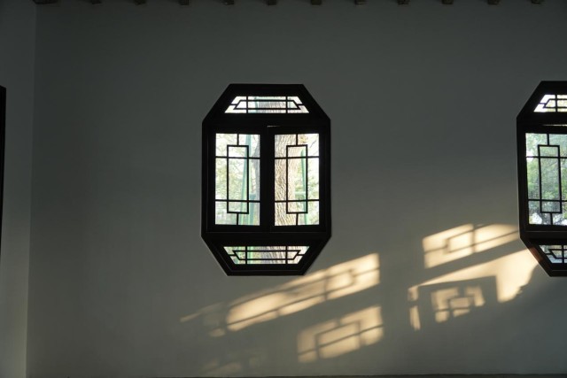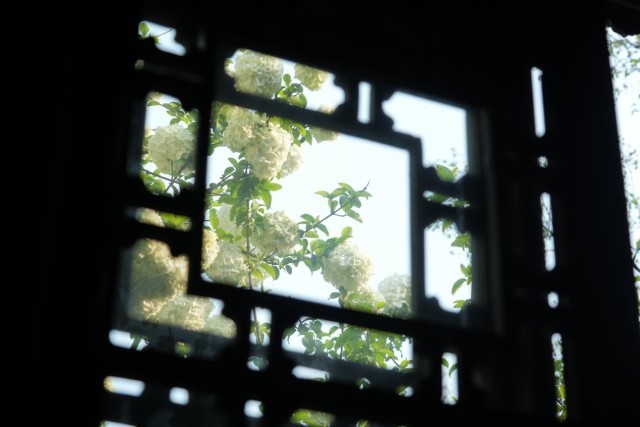 透过花窗,木绣球郁郁葱葱。邓宇轩 摄