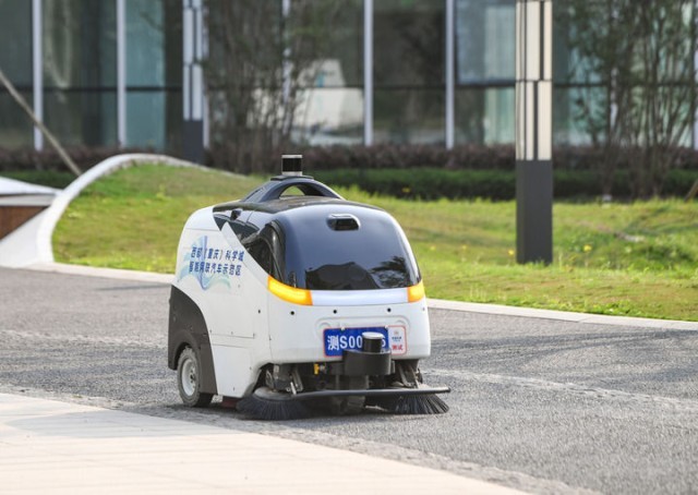 2025年4月11日,无人驾驶清扫车在重庆科学谷数智科创园进行清扫作业。新华社记者 王全超 摄
