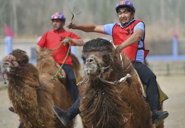 4月13日,村民在新疆于田县先拜巴扎镇农牧民运动场参加赛骆驼比赛。 新华社记者 胡虎虎 摄