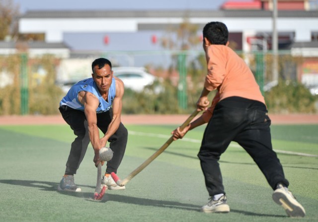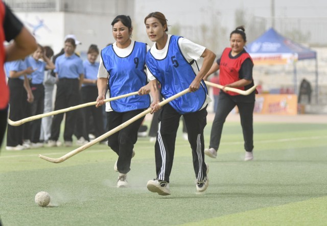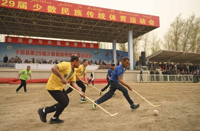 4月13日,村民在新疆于田县体育场参加女子麦热球比赛。新华社记者 胡虎虎 摄