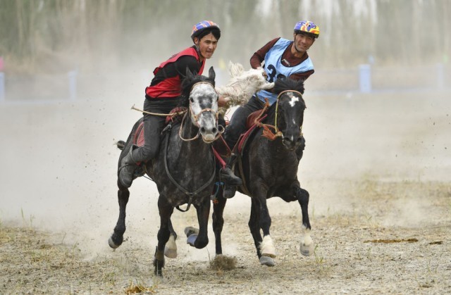 4月12日,村民在新疆于田县先拜巴扎镇农牧民运动场参加叼羊比赛。新华社记者 胡虎虎 摄