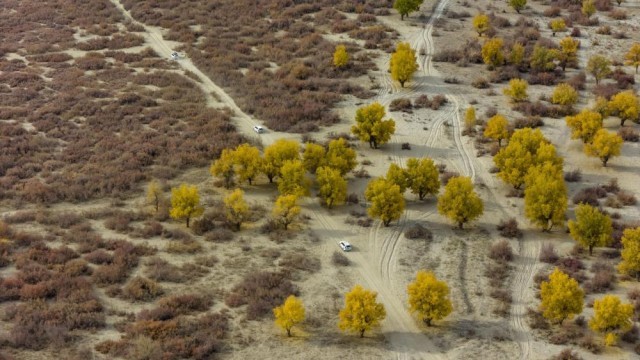 2024年11月6日,游客的自驾车队在新疆于田县达里雅布依旧址景区穿越胡杨林和红柳林(无人机照片)。新华社记者 陈朔 摄