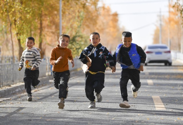 2024年11月9日,小朋友奔跑在新疆于田县达里雅布依新村。新华社记者 胡虎虎 摄