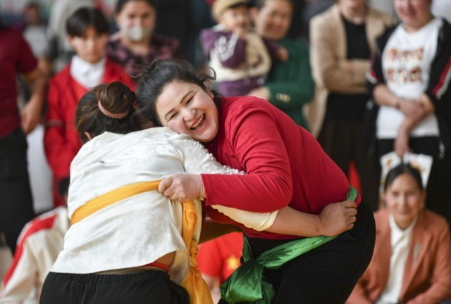 4月12日,村民在新疆于田县全民健身中心参加女子摔跤比赛。新华社记者 胡虎虎 摄