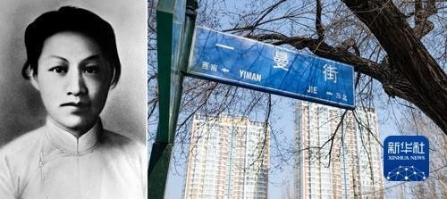 拼版照片:右图为哈尔滨市南岗区一曼街(新华社记者谢剑飞2025年4月8日摄);左图为赵一曼像(资料照片)。为了铭记抗战历史,部分城市的街道以抗战英烈的名字命名。一个个英雄的名字,定格下一段段难忘的抗战记忆,时刻提醒后人铭记历史、珍爱和平。