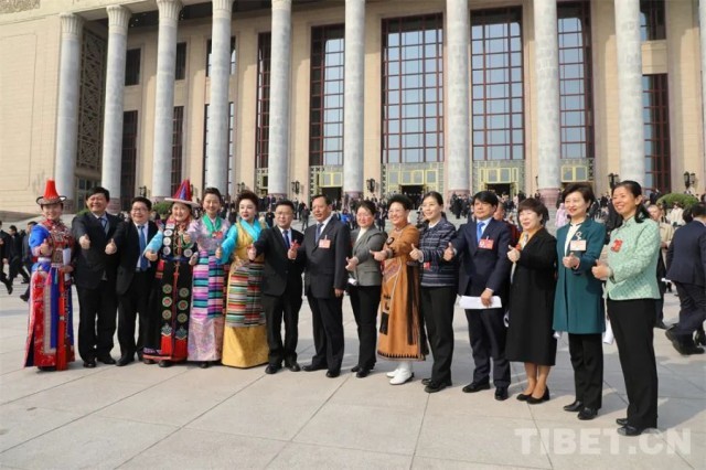 图为边巴拉姆在全国政协十四届二次会议闭幕后在人民大会堂外和其他委员合影 摄影:王茜