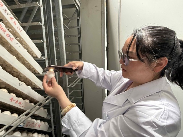 图为冯静在检查雪域白鸡的孵化情况