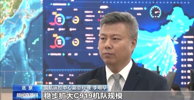 国航运控中心副总经理 李明早:自投运以来,国航严密生产组织,配齐保障力量,加强气象服务,抓好航班运行的各个环节,确保C919安全平稳运营。