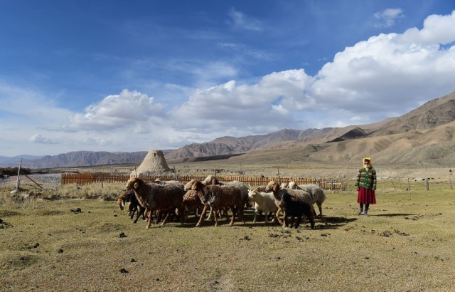 在新疆塔什库尔干塔吉克自治县,牧羊人在吉日尕勒文化遗址的亚尔特拱拜孜古驿站附近放牧(2021年5月3日摄)。新华社记者 侯昭康 摄