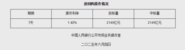 中新网6月4日电 据央行网站消息,2025年6月4日中国人民银行以固定利率、数量招标方式开展了2149亿元逆回购操作。具体情况如下: