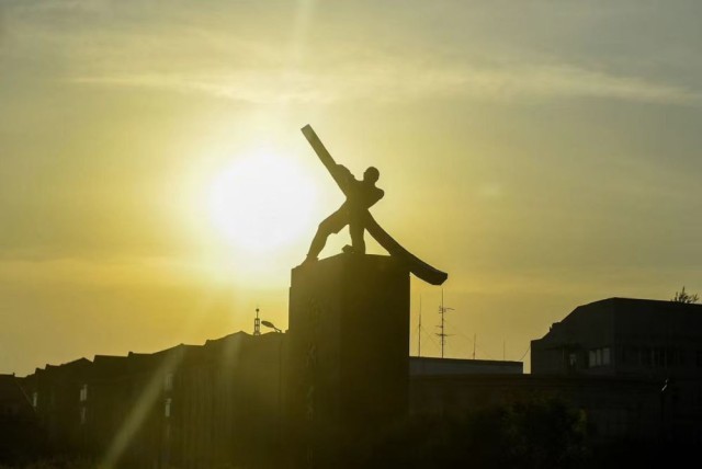 这是吉林市江城广场上的摇橹人雕像。新华社记者 颜麟蕴 摄