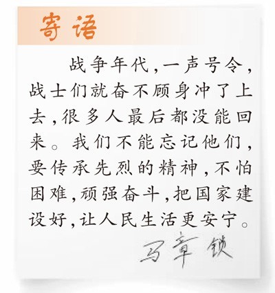 “战斗中,排长牺牲了,班长也牺牲了。我和另外几名战友几乎都身负重伤,艰难地带着电台突围。”回忆起战斗中牺牲在身边的战友,马章锁老泪纵横,“后来,我们终于赶跑了侵略者!我无数次梦见牺牲的战友,我把他们抱得紧紧的,分享胜利的喜讯。”