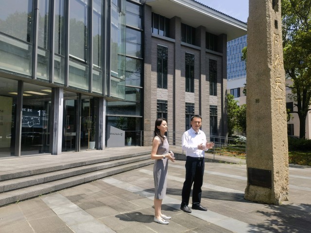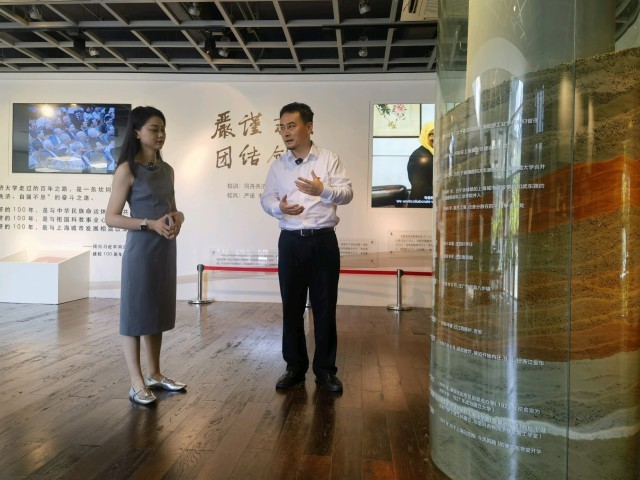 同济大学档案馆馆长(右一)介绍校史馆总体情况。中青报·中青网记者 蔡华丽/摄