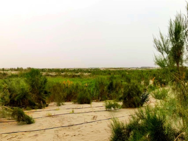 记者采访时,忽然刮起一阵风,似乎是在发出挑衅。“以前这种天气,得把自己捂严实了,不然眼睛都睁不开。”努尔吉马力指着远处的大片绿色,满满的自豪感。