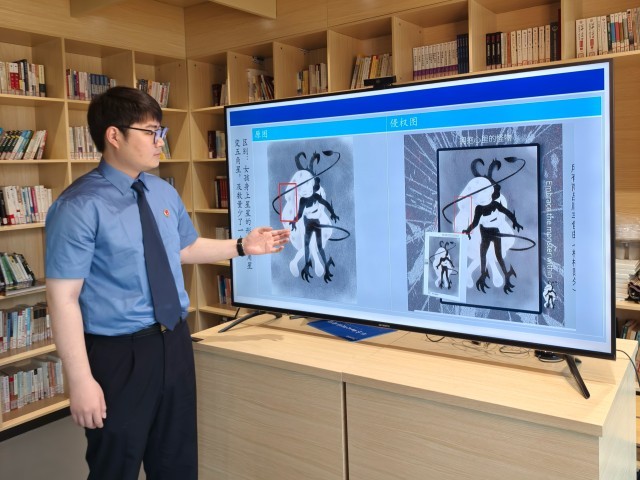 办理该案的北京市通州区人民检察院检察官助理王仕民介绍原图与侵权图的差别。刘胤衡/摄