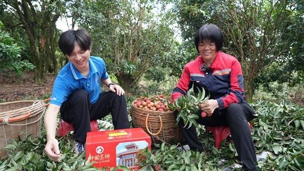 广东果农在快递工作人员的帮助下分拣荔枝。受访者供图