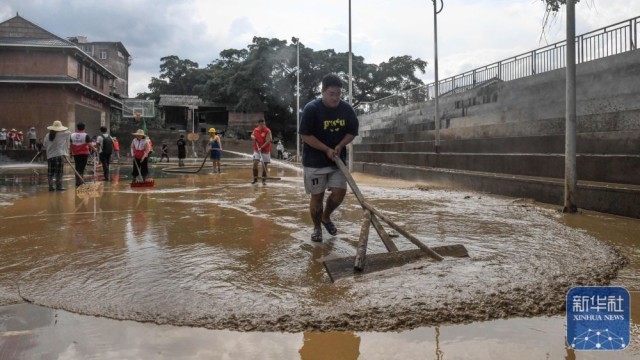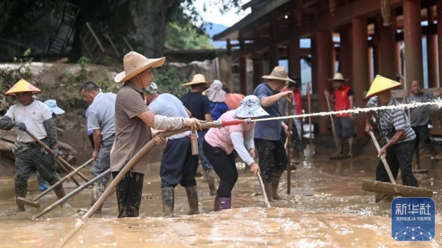 ↑ 6月26日,在三江侗族自治县良口乡良口村,志愿者和村民合力清理淤泥。