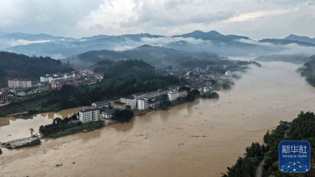 ↑ 这是被淹的三江侗族自治县良口乡良口村(无人机照片,6月25日摄)。