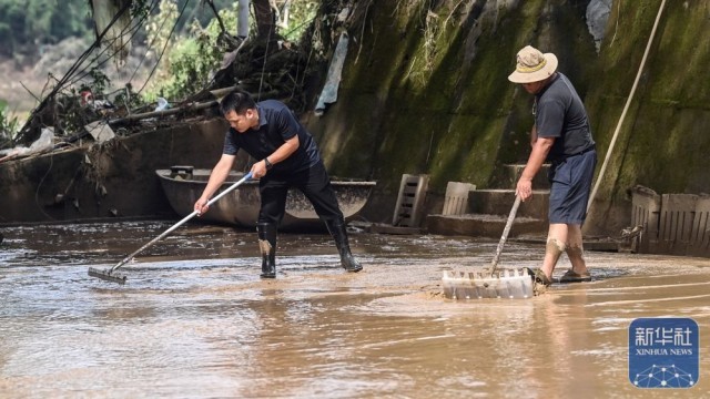 ↑ 6月26日,人们在三江侗族自治县良口乡良口村清理淤泥。