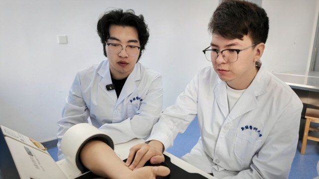 5月9日,卡力别克·叶尔波森(右)在新疆医科大学使用脉象模拟仪器练习脉诊(手机照片)。新华社记者 王泽宇 摄