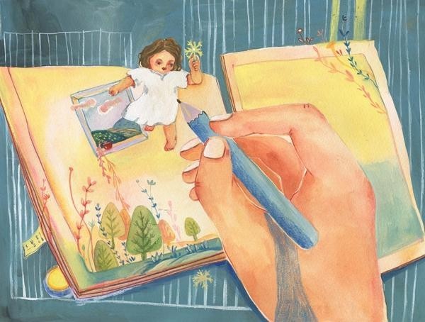 爸爸在离老家好几百公里外的乡镇工作,那几年,我还在上幼儿园,总盼着假期回老家玩。记得好多个早晨,天还没亮,爸爸就会把我从被窝里抱出来,穿好衣服,先坐公共汽车,之后又坐上绿皮火车,这家伙“哐当哐当”地喘着粗气,力气很大。我靠在爸爸温暖的怀里,看妈妈变魔术似的从包里掏出小面包,奶油夹心的甜味儿混着车厢里奇怪的味道,竟成了我记忆里独特的“旅途味道”。我把脸贴在蒙着雾气的车窗上,看着路边的电线杆拖着长长的尾巴往后跑……直到星星挂满天空,才终于听见奶奶的呼唤:“妮儿回来啦!”