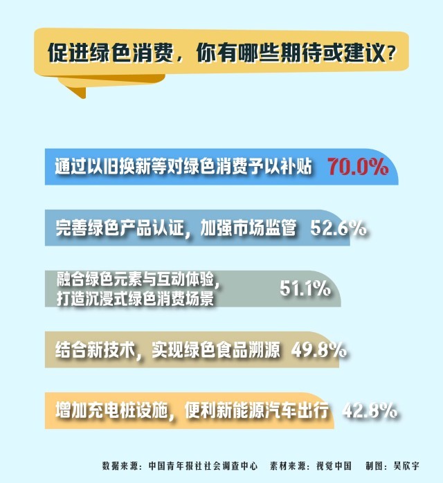 对于促进绿色消费的建议,70.0%的受访青年期待通过以旧换新等对绿色消费予以补贴,让消费者买得实惠;52.6%的受访青年建议完善绿色产品认证,加强市场监管;51.1%的受访青年希望融合绿色元素与互动体验,打造沉浸式绿色消费场景。