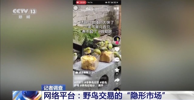 在一些涉及野生鸟类买卖的视频中,有的配上鸟儿吃食的画面,旁边还刻意加上“爱鸟护鸟”“自家繁殖”等标签,试图通过这样所谓的“合法”包装来打消购买者疑虑,吸引公众下单。